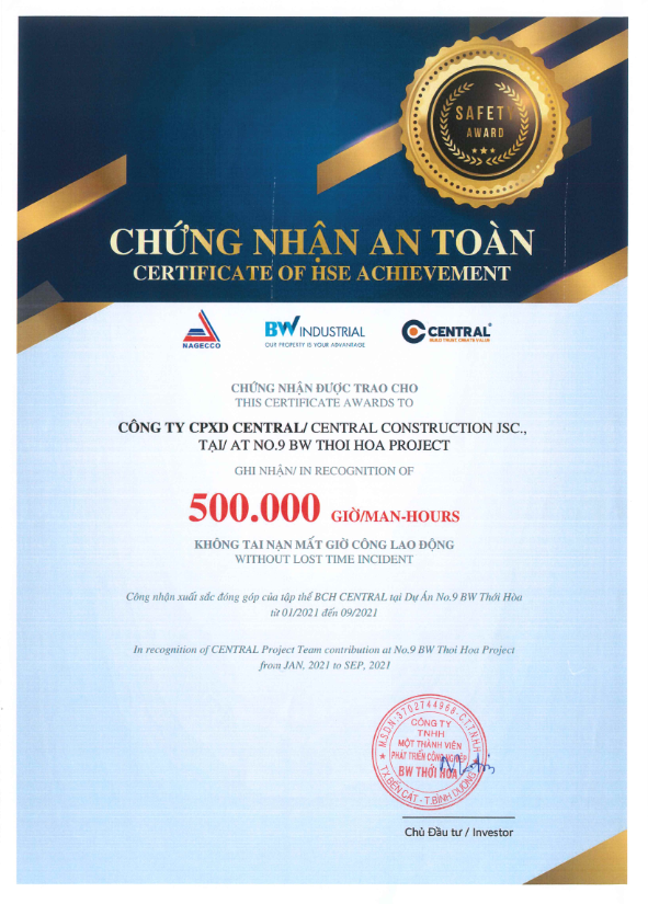 Certificate of HSE Achievement 500.000 man-hour at No.9 BW Thoi Hoa project