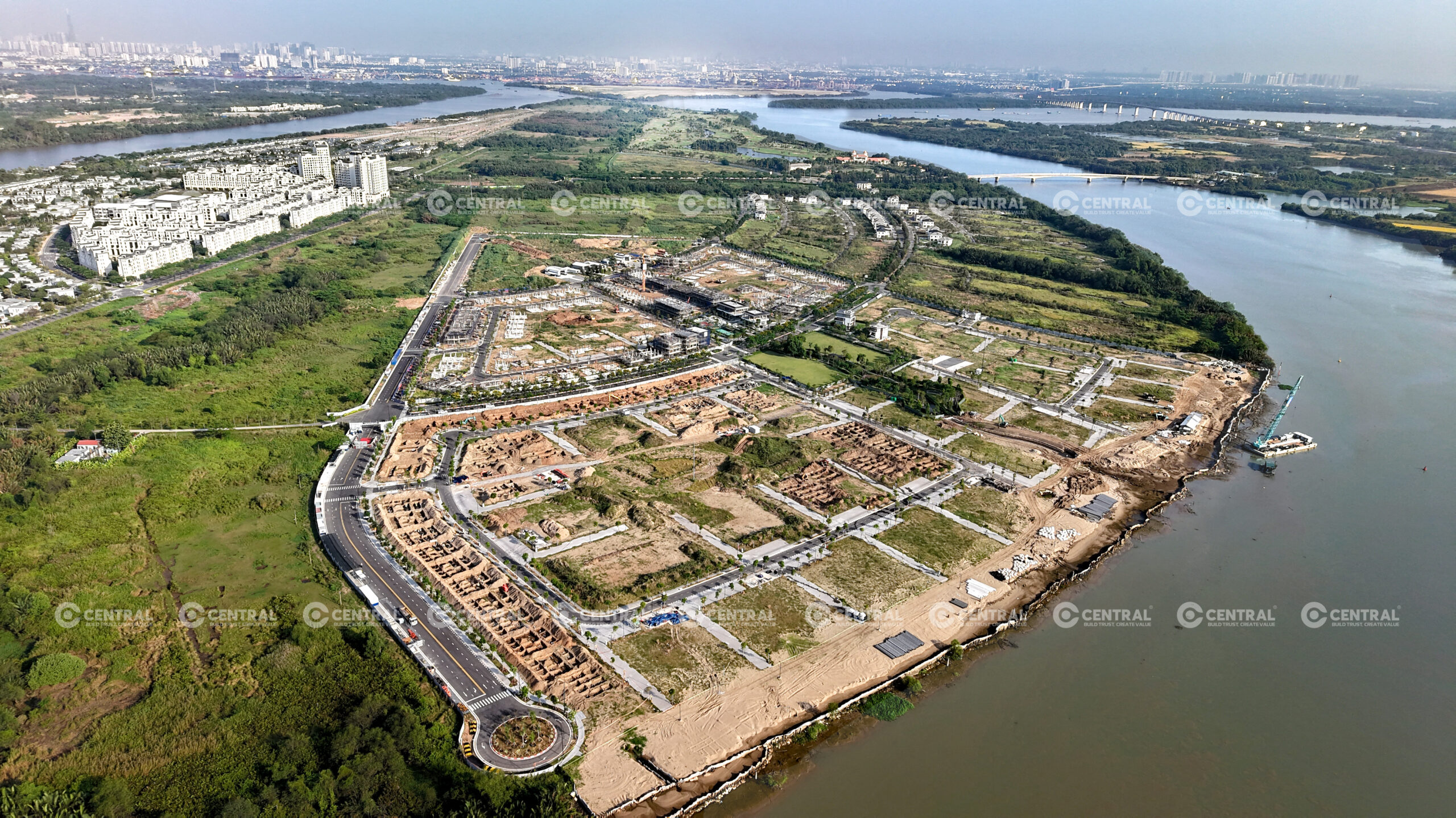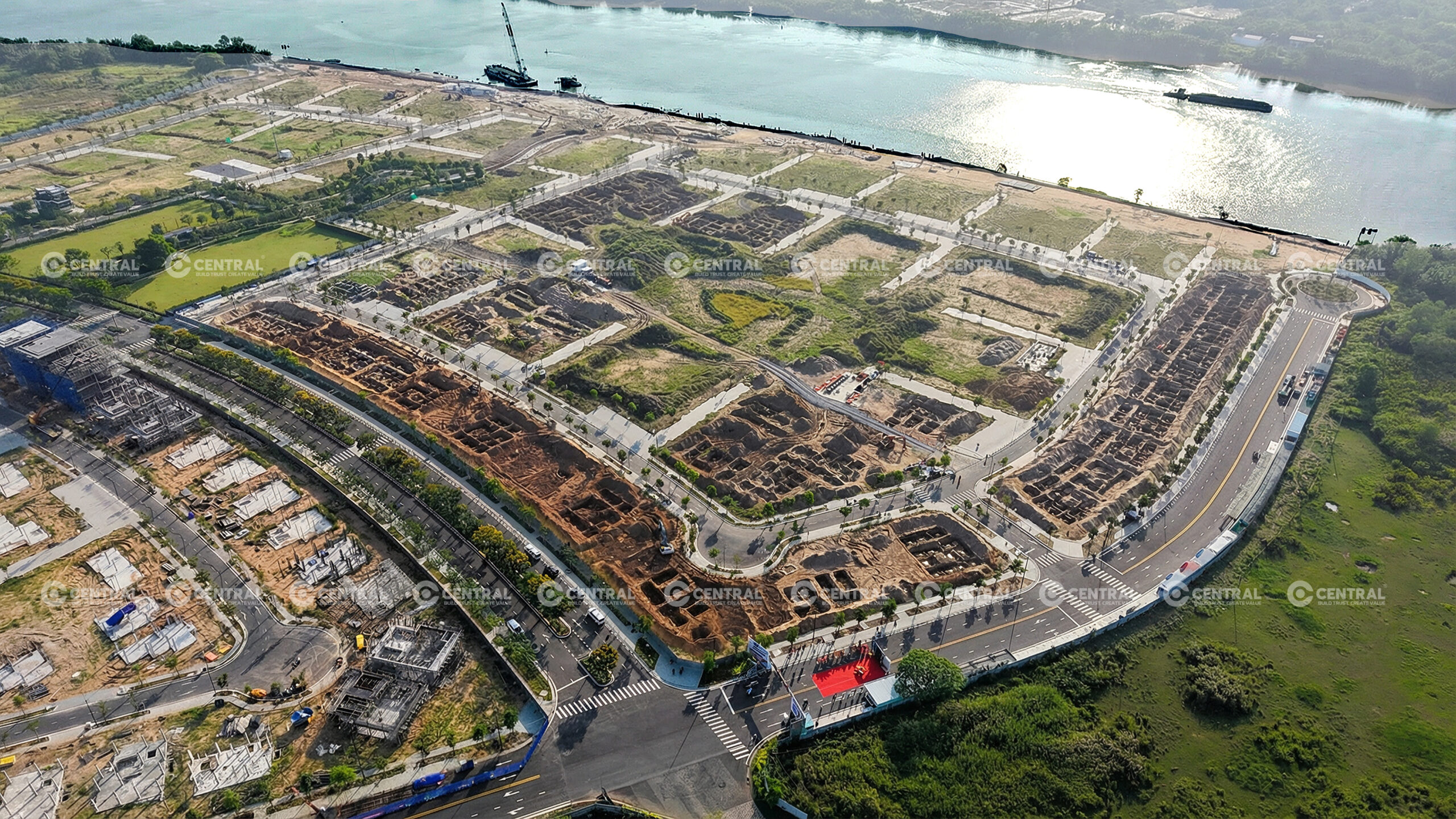 Đảm nhận vai trò Tổng thầu triển khai thi công dự án, CENTRAL đặt trọng tâm tìm ra các giải pháp xử lý đặc thù dành riêng cho các dự án ven sông với cơ địa nền đất yếu, mực nước ngầm cao và ảnh hưởng thủy triều. Quá trình thi công được lên kế hoạch kỹ càng và kiểm soát chặt chẽ bởi BCH CENTRAL thông qua việc ứng dụng các biện pháp giữ ổn định nền móng kết hợp gia cố nền và giải pháp chống thấm cho các hạng mục ngầm nhằm đảm bảo tính ổn định lâu dài cho dự án.