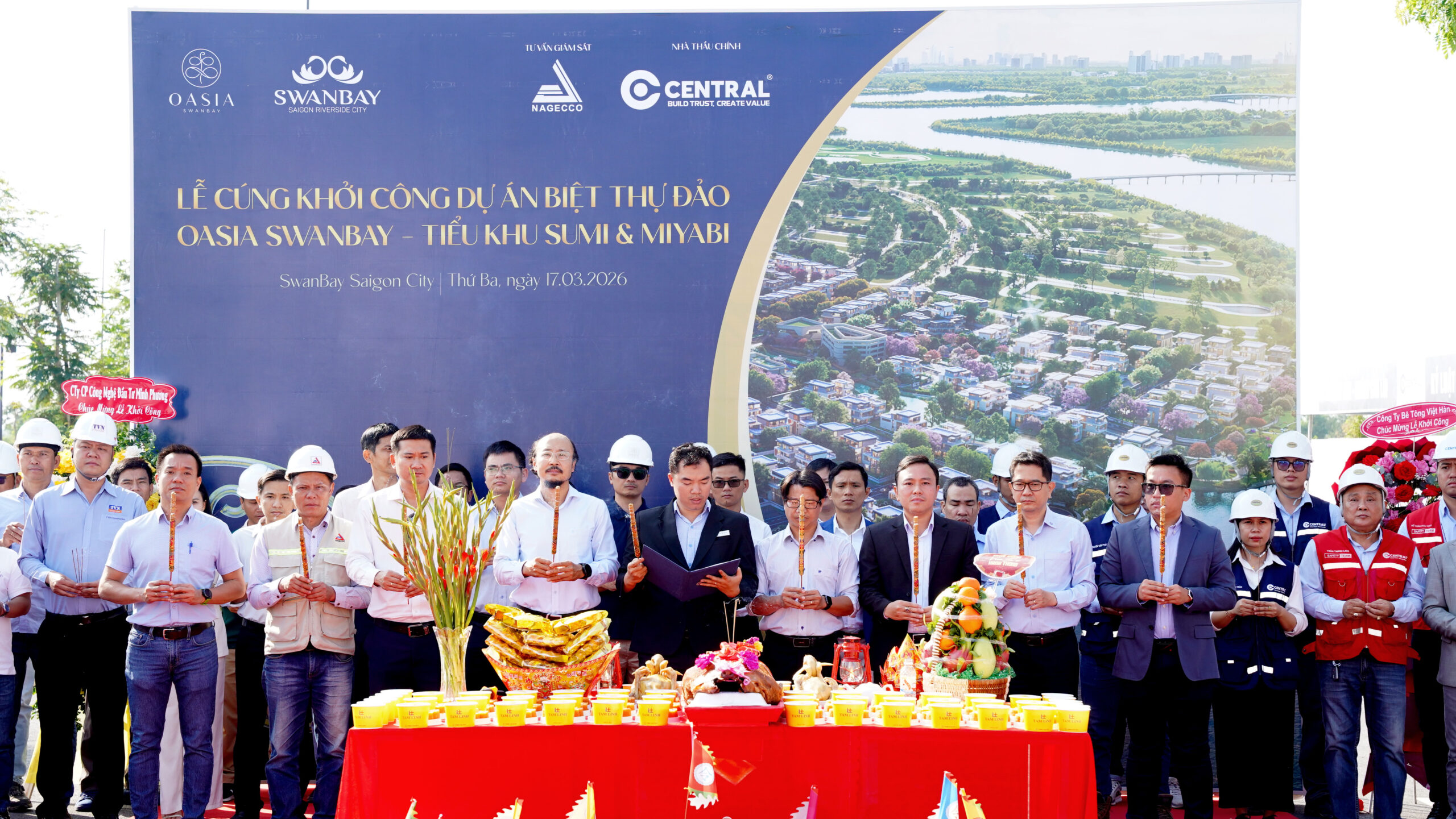 Sáng ngày 17/03/2026, CENTRAL phối hợp cùng Chủ đầu tư Cty CP Đại Phước Swancity One Mea tổ chức Lễ khởi công dự án Biệt thự Oasia SwanBay, Tiểu khu Sumi & Miyabi nằm trong Khu đô thị SwanBay tọa lạc trên đảo Đại Phước phía Đông Sài Gòn.